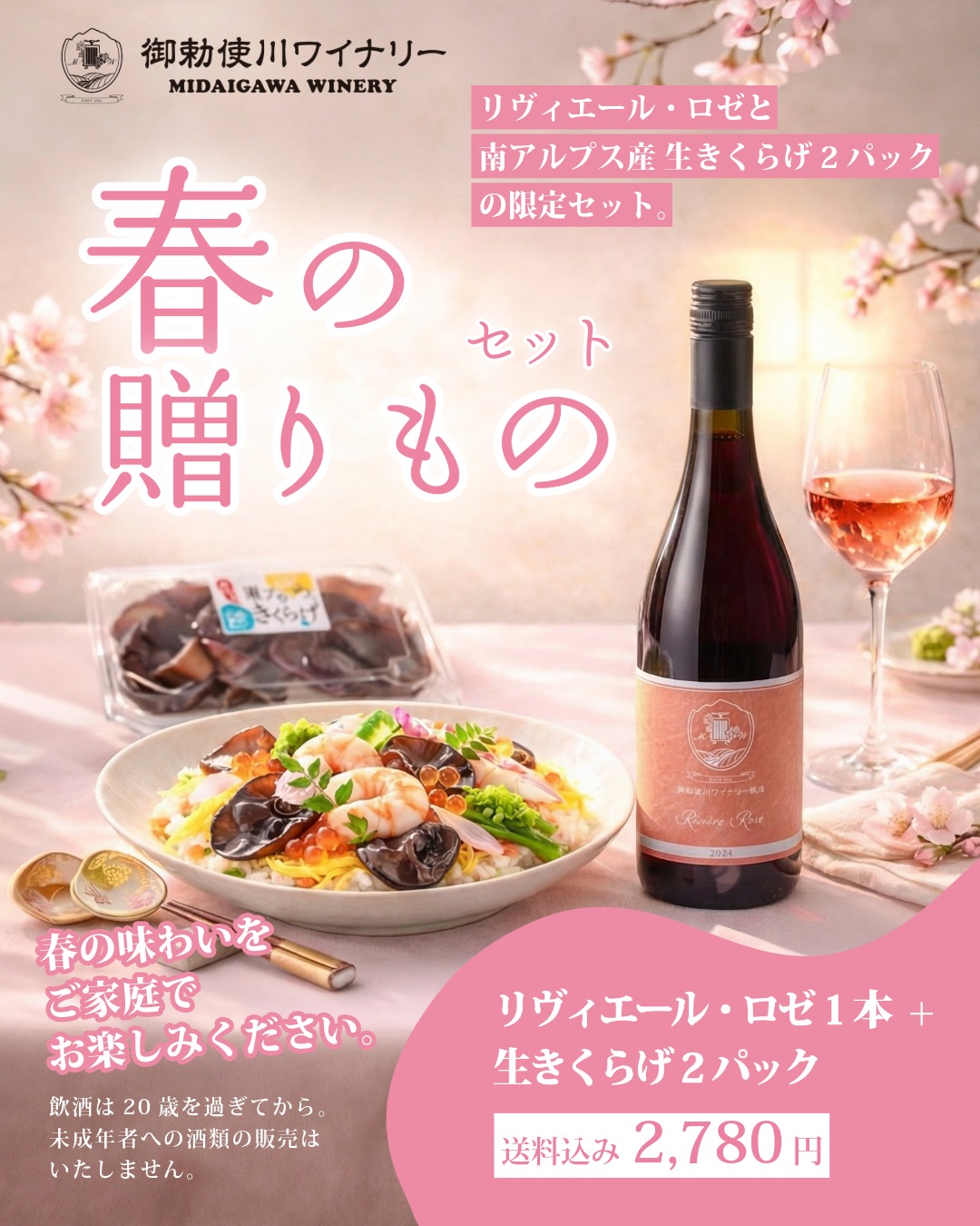 南アルプスで作った桜色のリヴィエール・ロゼ2024と、みずみずしく肉厚のフレッシュきくらげ2パックを春のセットにしました